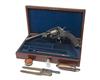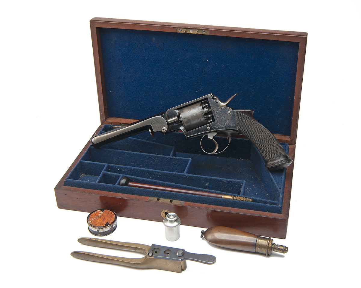 conforming to patent no. 2690 of October, 1858, with 6in. octagonal barrel (much original blued finish), dove-tailed fore-sight, the borderline engraved top-strap signed 'CHARLES REEVES IMPROVED PATENT DOUBLE-ACTION', standing notch back-sight to rear, plain colour hardened borderline engraved five-shot cylinder (faded), borderline and scroll engraved solid frame with screwed side-plate, guarded double-action trigger, long-spurred hammer, chequered one-piece semi saw-handled walnut grip swollen at the pommel and fitted with moulded and engraved iron cap, articulated loading lever mounted to left hand side of barrel with pin release for cylinder arbor retained by a flat spring, the whole retaining much original finish and complete with a period walnut storage case, compartmented and lined in dark blue baize and containing an Adams type mould numbered 5896, mahogany cleaning rod, cap tin, oil-bottle, turnscrew and later powder flask