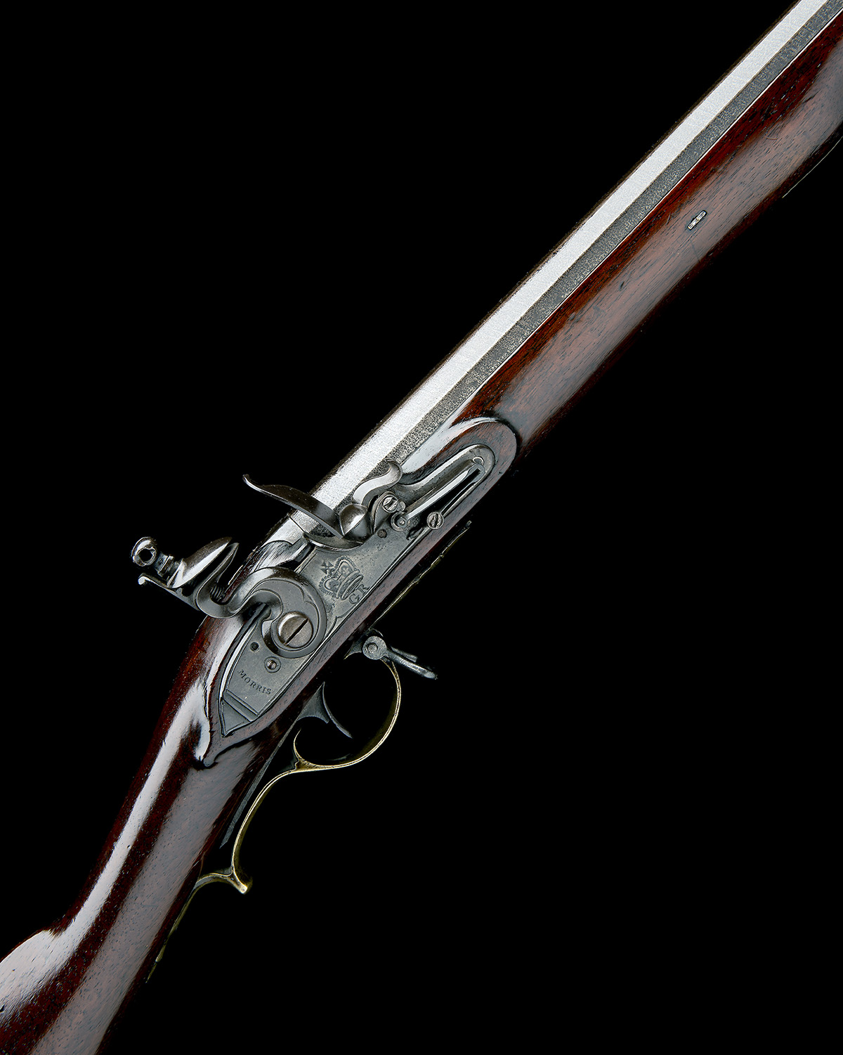 circa 1805, with slightly swamped octagonal 28in. barrel rifled in seven grooves, shallow brass fore-sight, Tower proofs at breech, the top-tang engraved with a light infantry bugle device and pierced for a probably later aperture sight (now absent), flat bevel-edged lock with stepped and pointed tail signed 'MORRIS', 'G.R.' and crown device below the semi-rainproof pan, swan-neck cock, roller to the frizzen spring, walnut full-stock with brass furniture including patchbox to the right hand side of butt, shaped heel-plate with stepped top-spur, spurred trigger-guard tang, moulded side-plate, ramrod thimbles with rolled ends and captive iron ramrod, the stirrup mounted to the muzzle-sides.