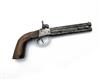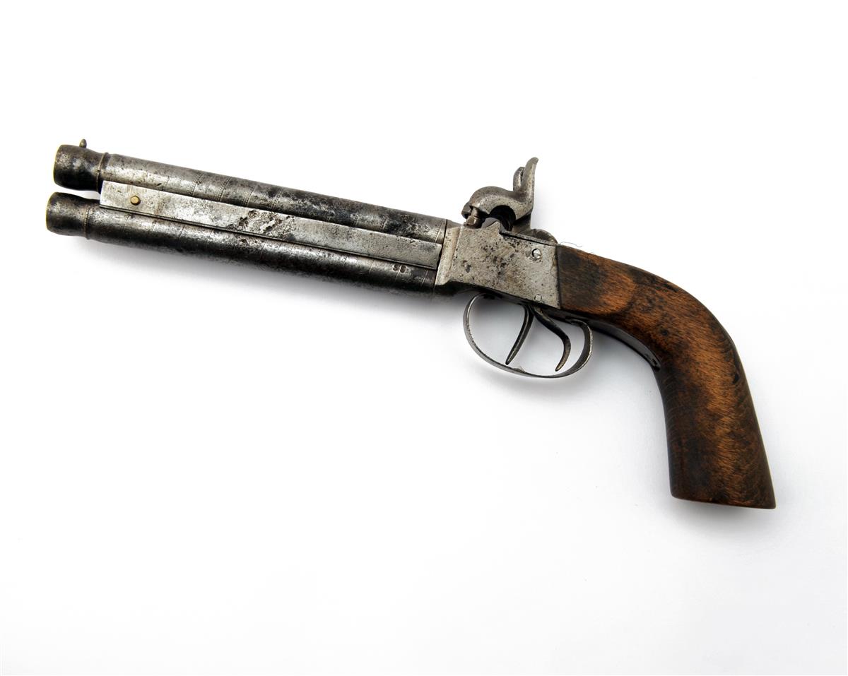 A 54-BORE PERCUSSION OVER-UNDER TRAVELLING PISTOL, UNSIGNED, no visible serial number,