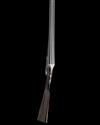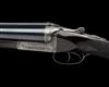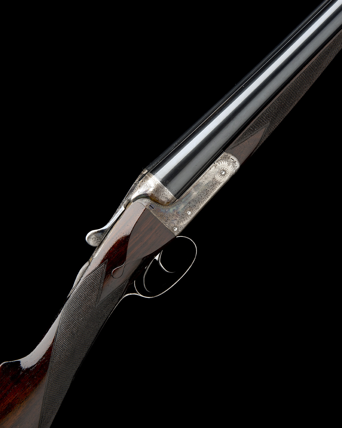 30in. nitro barrels, the rib engraved 'WILLIAM EVANS (FROM PURDEY'S) 63 PALL MALL. ST. JAMES'S. LONDON.', 2 1/2in. chambers, bored approx. true cyl. and 1/2 choke, treble-grip action with removable striker discs, intercepting sears, automatic safety with gold-inlaid 'SAFE' detail, best bold acanthus scroll engraving, retaining some original colour-hardening and finish, 14 1/4in. figured stock cast on for the left shoulder (shortened, the 1in. offcut with original buttplate present in case), weight 6lb. 13oz., in its brass-cornered leather case with some accessories, including W. Evans marked brass chamber brush and W. Evans snap caps