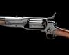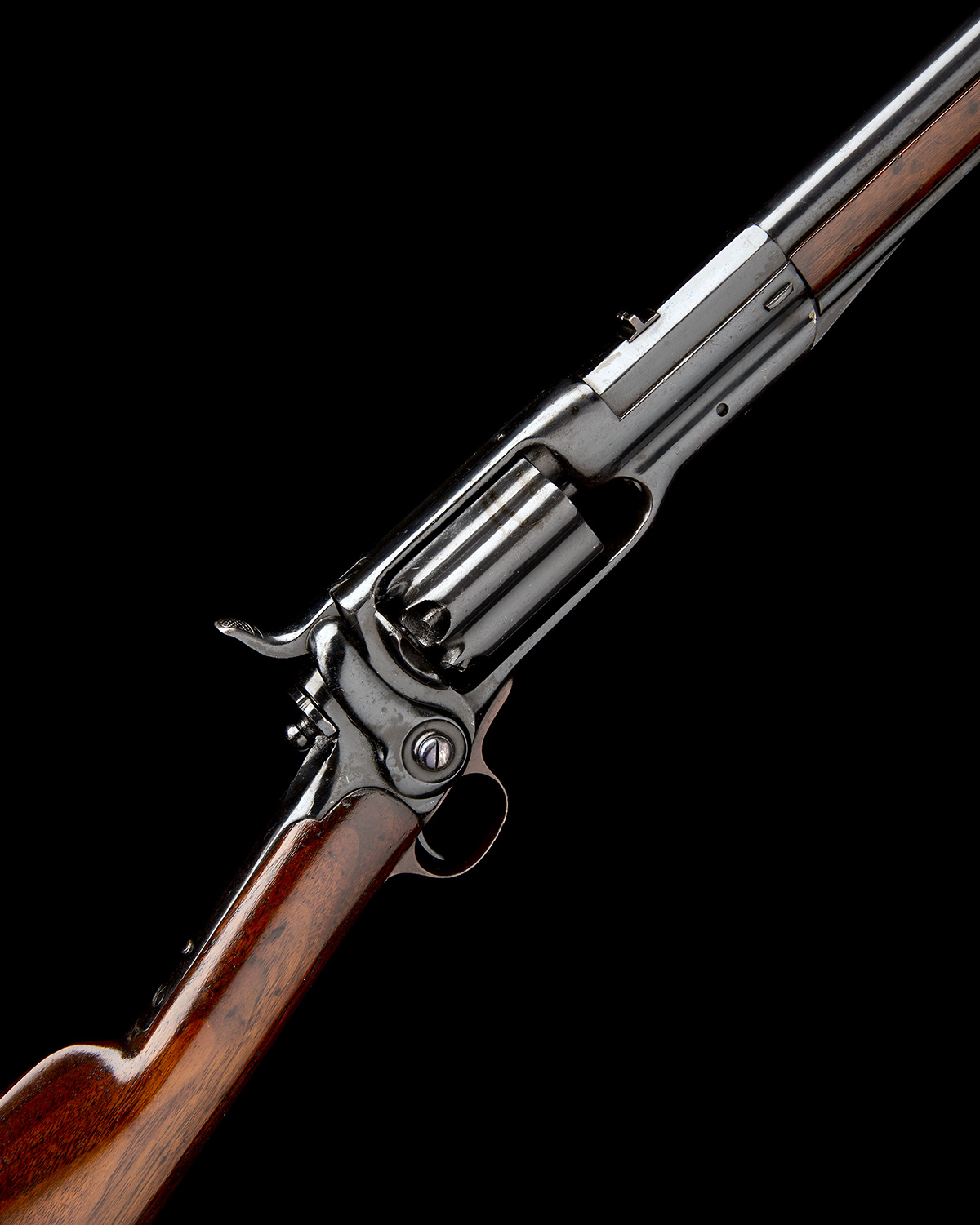 circa 1856-64 and probably cut down from an Artillery Carbine, with reblued two-stage 15 1/2in. barrel, dove-tailed blade fore-sight, standing notch rear-sight, sighting groove to the top-strap with traces of makers details, reblued solid frame with side-hammer, five-shot fluted cylinder, plain walnut straight hand butt-stock, walnut fore-end with single barrel-band and semi concealed loading lever, missing nose-cap, detail worn.