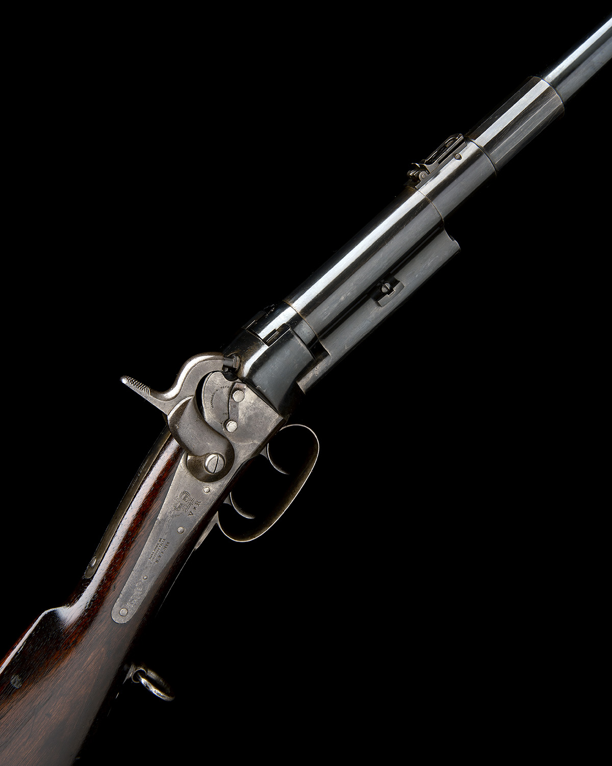 dated for 1856, with tapering round 18in. barrel, dove-tailed block and blade fore-sight, elevating ladder rear-sight, central section of outer barrel faceted for grip, plain receiver, long plain top-tang marked 'GREENE'S PATENT JUNE 27 1854', back-action lockplate fitted with 'Maynard's' tape priming system and marked 'MASS. ARMS CO. CHICOPEE FALLS USA 1856' a 'VR' crown cypher and 'MAYNARD'S PATENT SEPT 22 1845', plain hammer, walnut butt-stock with iron patch-box and semi-crescent heel-plate, saddle-ring to the trigger-guard tang, large trigger-guard bow with two triggers, the front one unlocking the barrel for loading, ordnance stamps and no provision for fore-end, the whole an older expert refinish