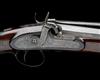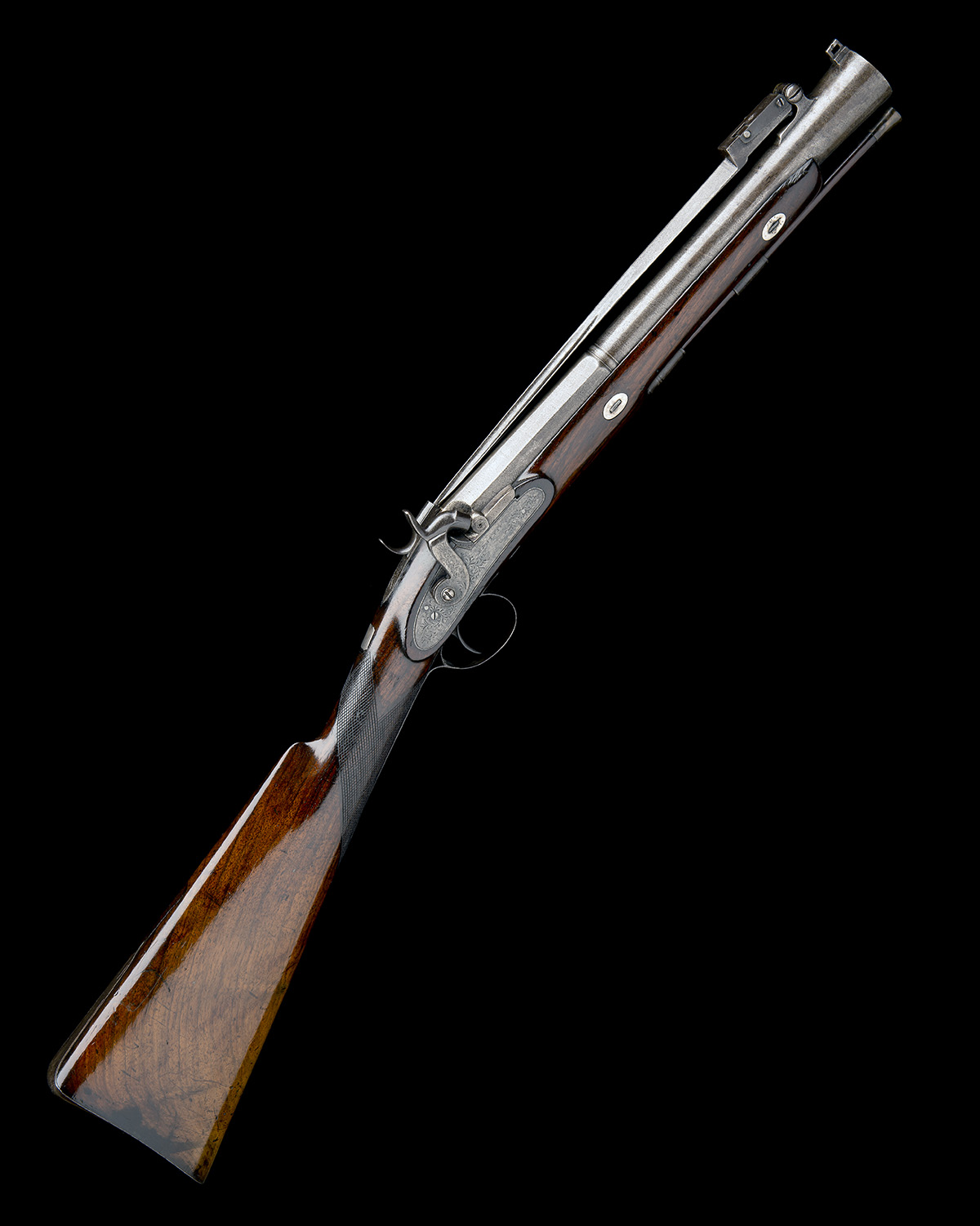 probably converted from flint circa 1825, with twist iron two-stage 14 1/2in. flaring barrel, the top mounted with a concave sided triangular sprung bayonet released via a catch on the top-tang, engraved band and platinum line at breech, border and scroll engraved top-tang, borderline and scroll engraved bar-action lock signed 'BEATTIE', engraved slab sided dolphin headed hammer, walnut full stock chequered at the wrist and finishing 2 3/8in. short at the muzzle, engraved iron furniture and twin oval escutcheoned barrel keys, complete with its original ramrod, some mild pitting to exposed iron surfaces