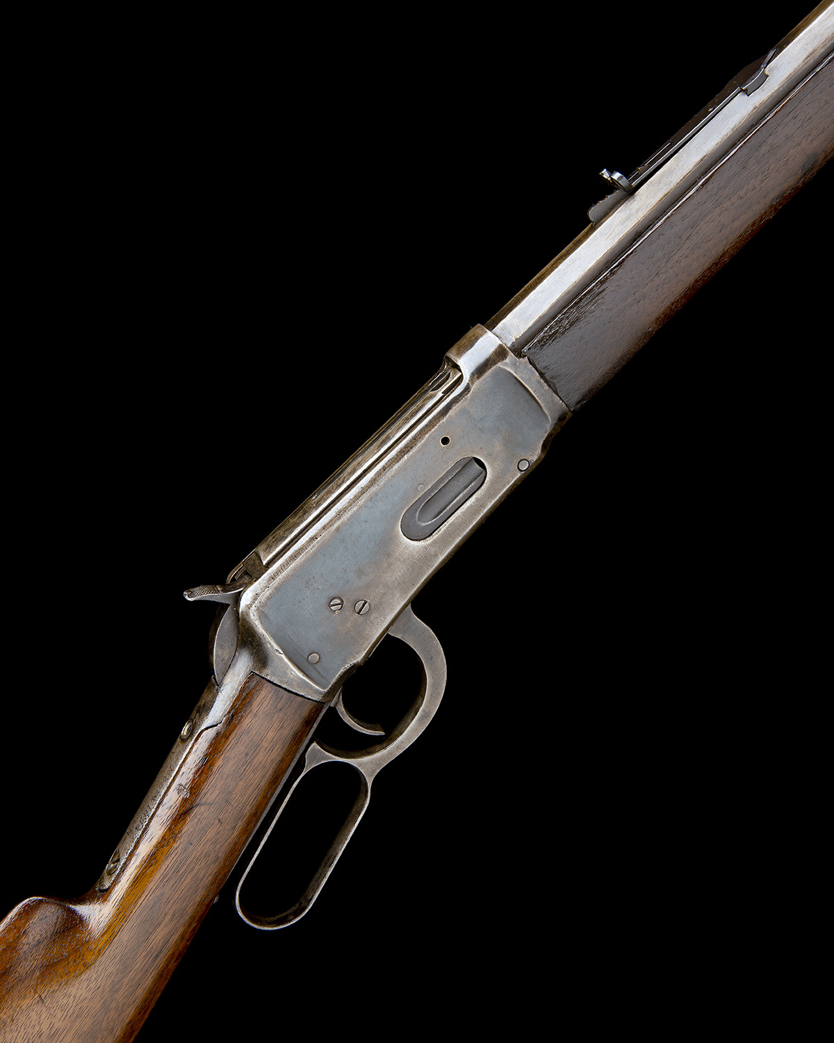 for 1897, the last digit of serial number nearly erased, with octagonal 26in. barrel signed by the maker, dove-tailed fore-sight, buckhorn rear-sight, slab-sided receiver with side loading gate and top eject, model designation to top-tang (peep-sight mounting points enlarged), walnut butt-stock, iron crescent heel-plate and finger-lever, walnut fore-end with iron nose-cap and full-length under-barrel magazine tube, finish worn