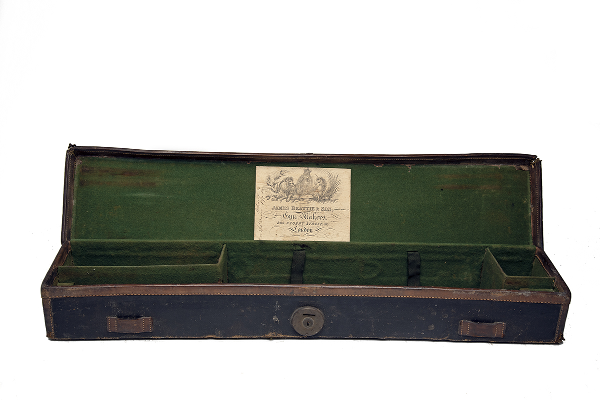 A JAMES BEATTIE & SON CANVAS AND LEATHER SINGLE GUNCASE, fitTed for 30in. barrels, the interior lined with green baize, a paper James Beattie & Son trade label, brass lock (damaged & key missing)