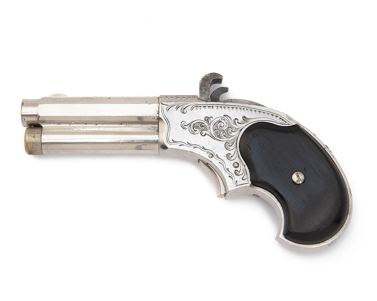 no visible serial number, manufactured between 1871 & 1888, with octagonal 3in. barrel, rounded muzzle, the top-flat signed 'E. REMINGTON & SONS ILION' over 'RIDER'S PAT. AUG 15th 1871', scroll engraved receiver, twin cocking and loading hammers, smooth wood birdshead slab-sided grips (right cracked and repaired) and under-barrel tubular magazine, the whole retaining virtually all its original plated finish