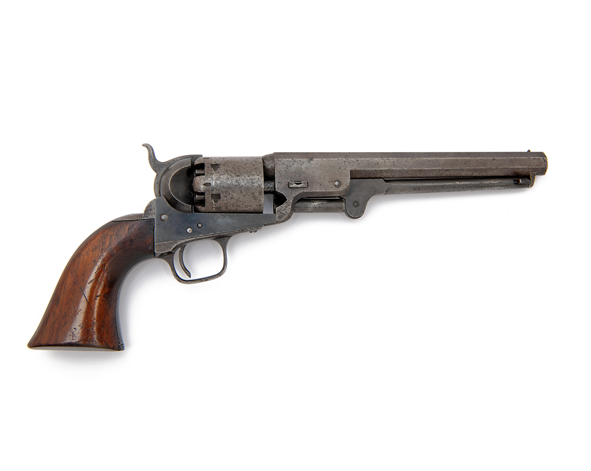 for 1855, with 7 1/2in. octagonal barrel, the top-flat signed 'ADDRESS COL. COLT, LONDON', bead fore-sight, London proofs, plain six-shot cylinder scrubbed of scene, open iron frame marked 'COLT'S PATENT', dome headed action screws, iron trigger-guard bow and grip-straps, walnut one-piece smooth grip (left hand side with period working repair) and hinged under-barrel rammer, traces of finish, some pin-prick pitting.