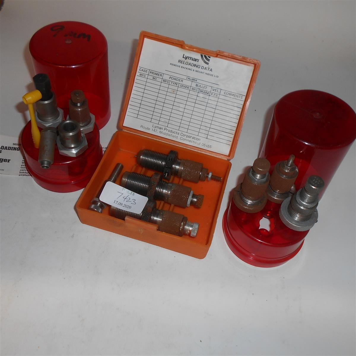 THREE PISTOL 3 DIE SETS, ONE LYMAN 9mm LUGER, ONE LEE 9mm LUGER ONE LEE 45 ACP Note: Corrosion is present on all pieces.