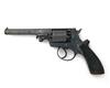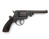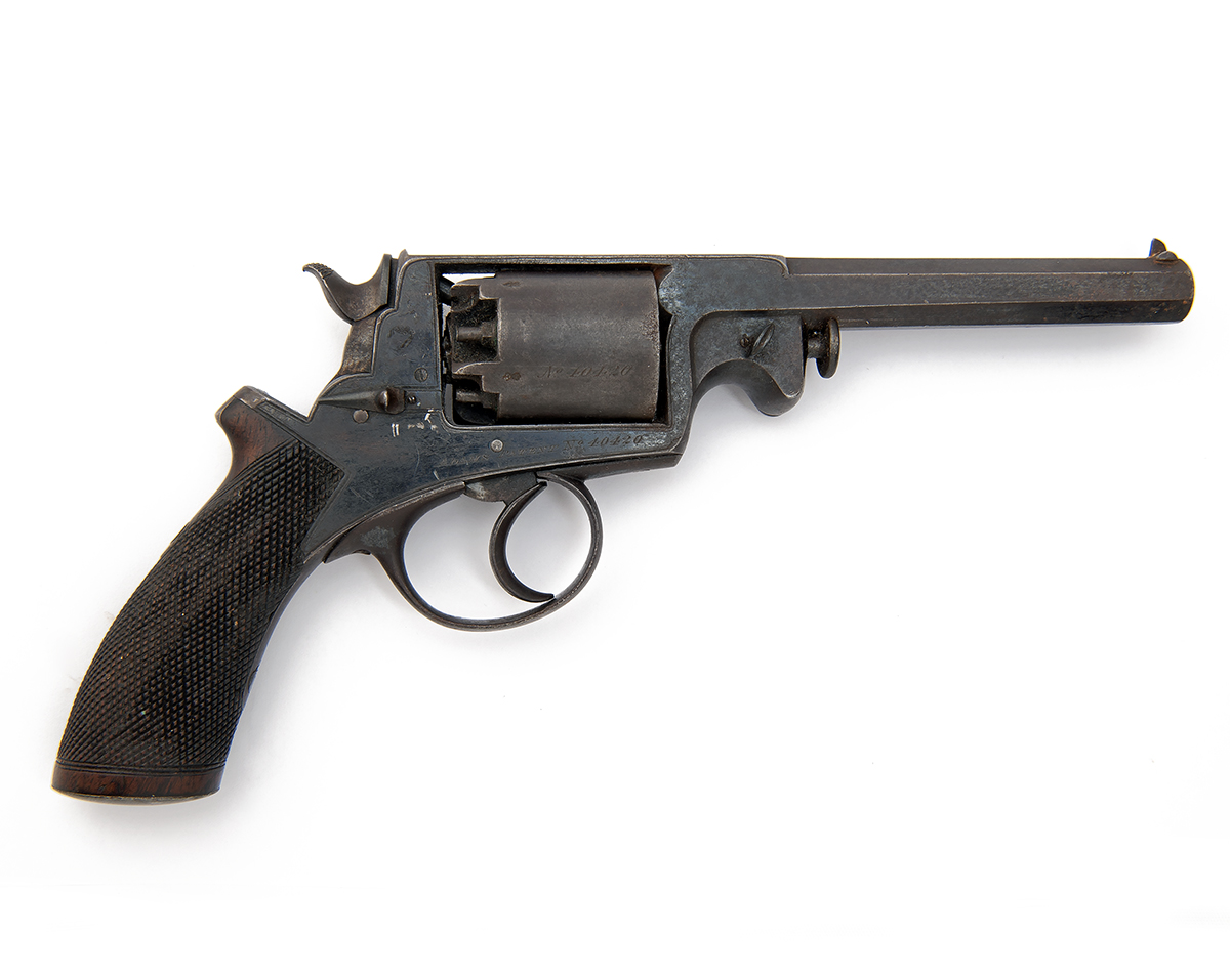circa 1860, with octagonal 5 3/4in. barrel, dove-tailed fore-sight, wing-nut release for cylinder arbor, borderline engraved solid frame, plain cylinder with London proofs, double action mechanism with spurred hammer, sliding safe to right side of frame, chequered walnut semi saw-handled grip, iron heel-plate and articulated rammer mounted to left side of barrel, traces of finish remaining