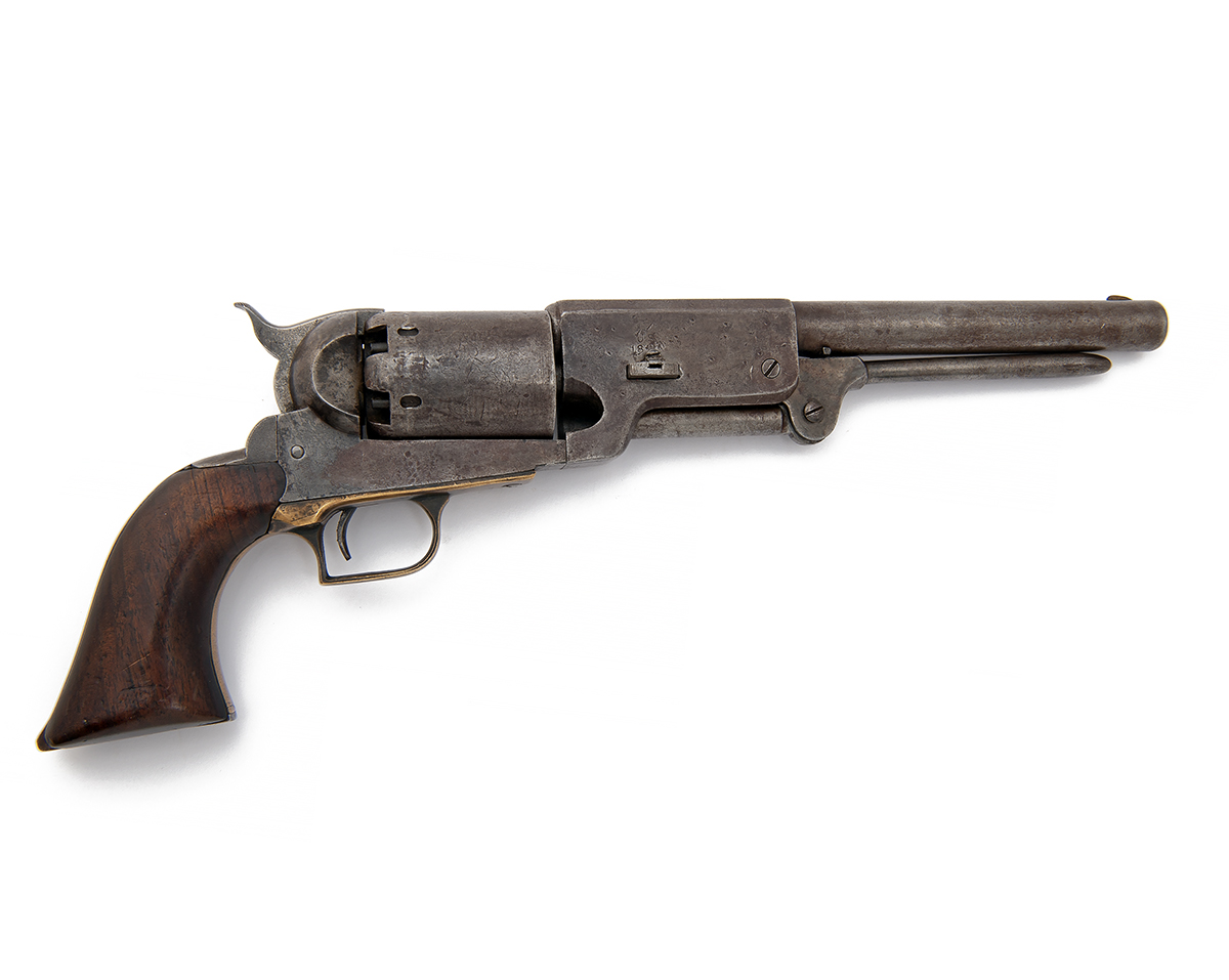 probably Belgian manufacture circa 1900, with 9in. barrel, large breech marked '1847' on the right and spuriously marked 'D. COMPANY No. 213' on the left, false maker's signature to top of breech, plain six-shot cylinder with traces of scene and oval locking notches, open iron frame also spuriously marked to 'D' Company, brass square-backed trigger-guard bow and front-strap, flared walnut grip stamped 'D. COM'Y' at heel (cracks and repairs) and articulated under-barrel rammer (finish worn, some pitting and bruising)