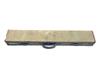 A GREEN CANVAS AND LEATHER FULL LENGTH RIFLE CASE, the interior lined with green baize, the internal measurements approx. 43 1/4in. x 6 3/8in. x 3 1/4in., brass lock (key missing)