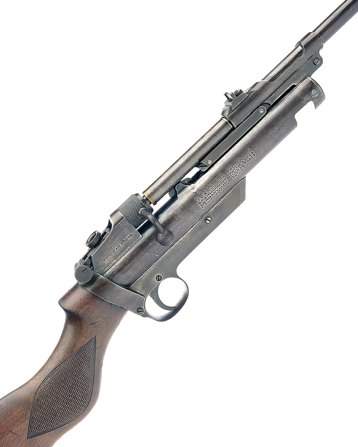 A .22 BARREL-COCKING AIR-RIFLE SIGNED WEBLEY & SCOTT, MODEL 'MKII SERVICE', serial no. S2871, circa 1934, with 25 1/2in. sighted removable barrel, bolt action breech lock, peep-sight to wrist, plain air-chamber, no provision for safety catch and semi saw-handled walnut butt-stock, finish worn
