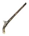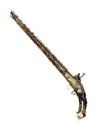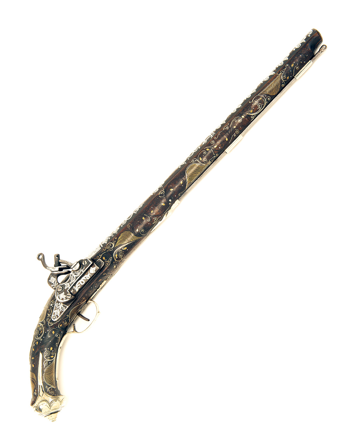Islamic circa 1820, with possibly earlier 19 3/4in. barrel (traces of fine damascening) profusely covered with bright white metal koftgari arabesques, white metal scroll engraved panel at breech, stamped makers mark within a white metal border, engraved white metal covering to top-tang, blackened iron miquelet lock with white metal koftgari decorated spring cover, frizzen front, cock and tail, hardwood full-stock profusely decorated with white and yellow wire inlays (some losses to decoration), heavy white-metal furniture including faceted butt-cap with side spurs (cap out of position on heel), white metal ramrod thimbles and square section iron ramrod with button head