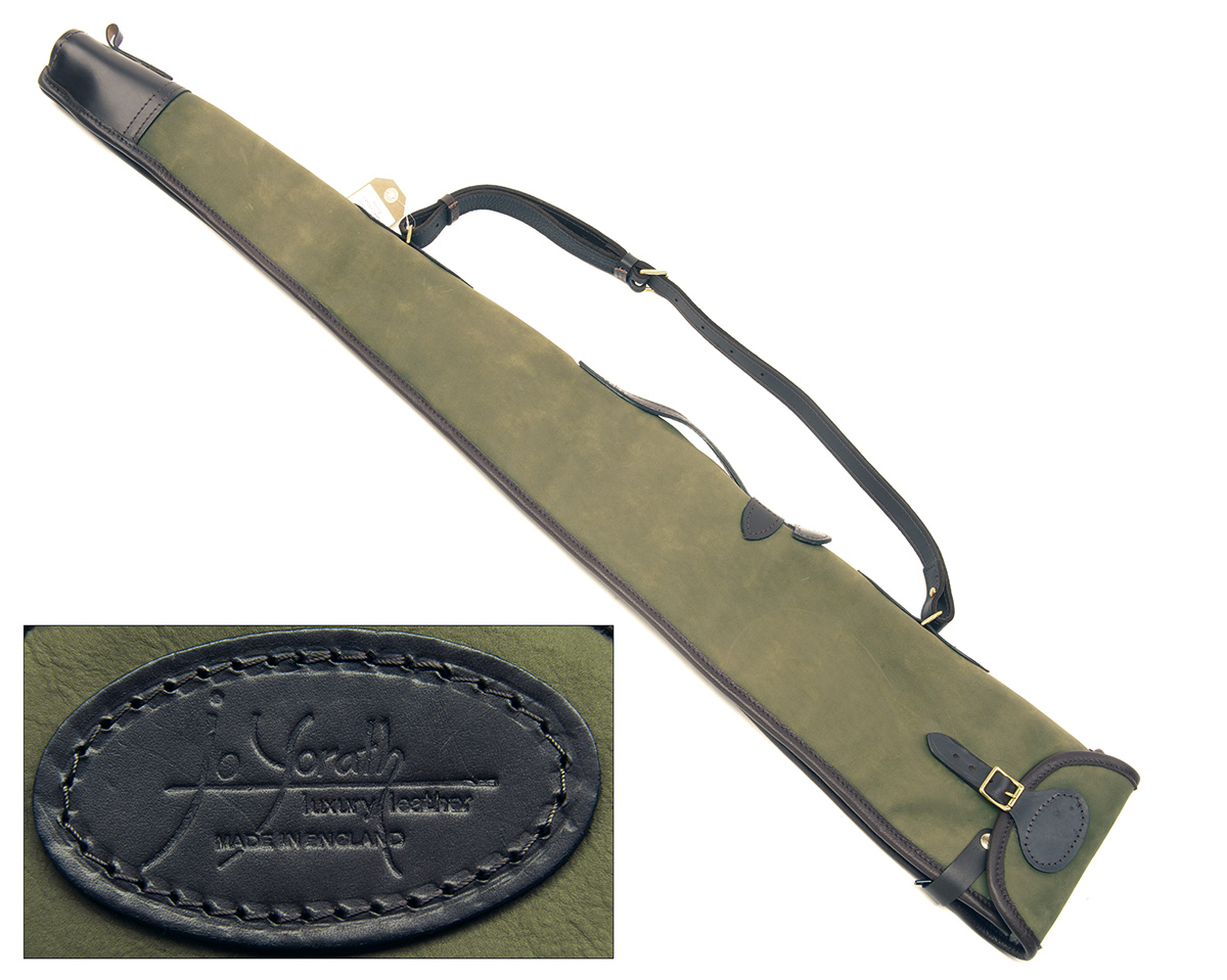 A NEW AND UNUSED OLIVE SUEDE AND LEATHER SHEEPSKIN-LINED SINGLE GUNSLIP,