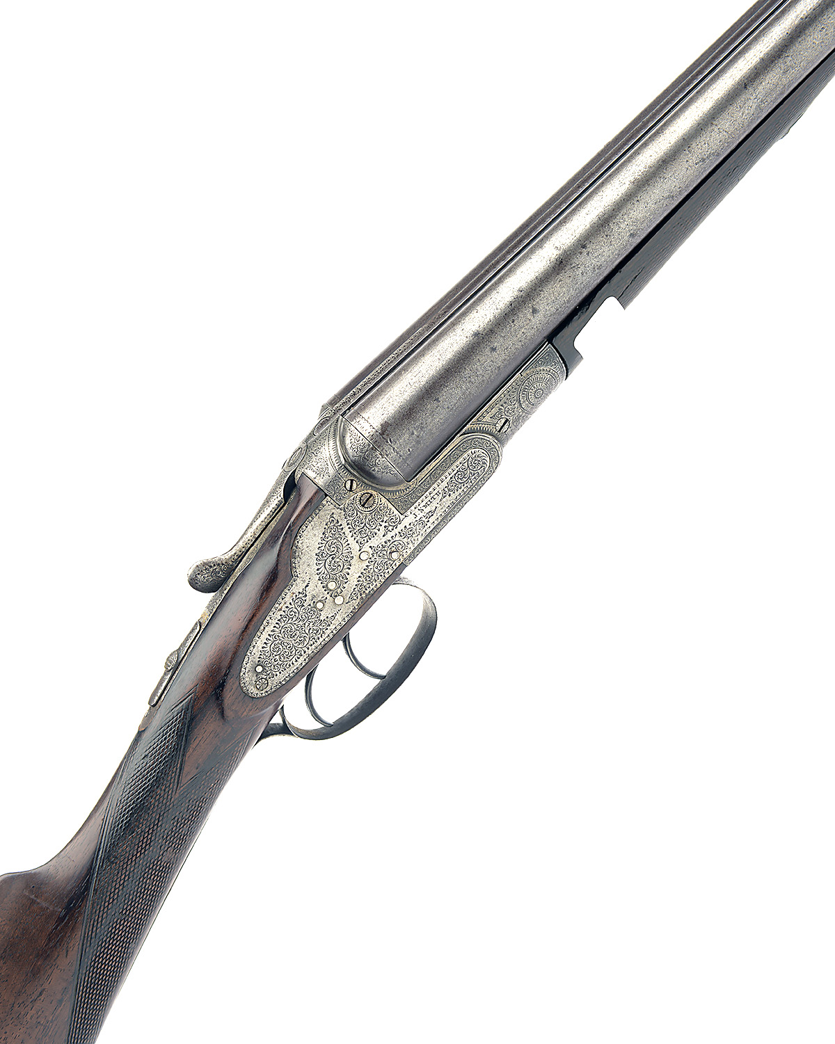 J. SMITH 12-BORE SIDELOCK NON-EJECTOR, n.v.s.n., 24 3/4in. nitro reproved barrels (pitted) , rib engraved 'J. SMITH. RIFLE WORKS. LOVEDAY ST. BIRMINGHAM.', 2 1/2in. chambers, bored approx. true cyl. in both, treble-grip action, automatic safety with gold-inlaid 'SAFE' detail, border and acanthus scroll engraving, 14 1/4in stock (cracked) including buttplate