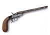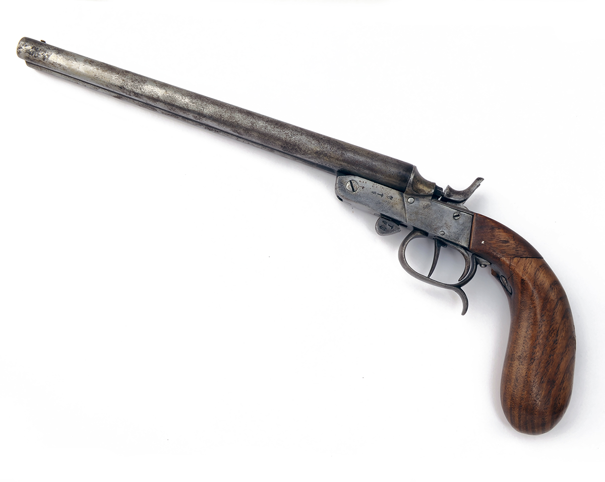 A .410 (2 1/2in.) DOUBLE-BARRELLED HAMMER SHOT-PISTOL SIGNED 'FOREIGN', serial no. 10, with break-open 10in. barrels, open iron frame with push button opening, twin central hammers, guarded triggers and bag-shaped walnut butt (repaired and losses at head), finish worn