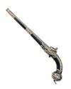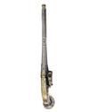 of typical form from the Caucasus circa 1800, with finely watered 12 1/2in. barrel slightly flared at the muzzle and with shallow moulded sighting ridge and band at breech, gold band and arabesque scrolls surrounding a deeply struck makers mark at breech, similar gold koftgari arabesque scrolls and a further band at muzzle, small miquelet lock also fully decorated with gold koftgari decoration to the bridge, hammer, mainspring and frizzen, black stippled leather-covered full-stock with gold koftgari decorated back-strap bordered with broad white metal niello decorated borders, typical white metal ball pommel with niello bands and arabesque scroll decoration, central niello decorated lanyard ring, nielloed complex shaped trigger-plate with exposed gold koftgari decorated ball trigger (at fault) and two broad embossed and nielloed barrel-bands