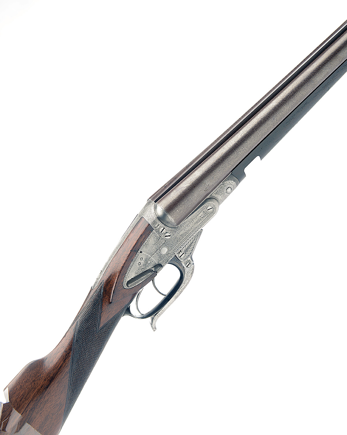 J.V. NEEDHAM 12-BORE 1874 PATENT HAMMERLESS SIDELOCK EJECTOR, serial no. 5121, serial number on barrels only, 28 1/2in. nitro reproved damascus barrels (some pits, wall thicknesses at 19), rib inscription worn illegible and numbered '2' toward the breech end, 2 1/2in. chambers, bored approx. true and imp. cyl., action incorporating Needham patent ejectors, patent no. 1205 of 1874, use number 144, right sideplate (fractured) with manual safety lever with gold-inlaid 'SAFE' detail, feathered border and acanthus scroll engraving, some pins replaced, 14 1/2in. stock (likely replacement), weight 6lb. 9oz.