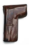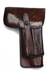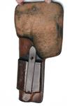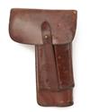 circa 1916, with 5in. barrel, blued slide with maker's details, patent dates to 1913 and calibre designation, blued frame with grip-safe, chequered walnut grips with diamond shaped panels around the fixing screws, smooth mainspring housing and correct magazine, retaining much probable original finish, complete with an English type full-flap leather holster with twin magazine pouches to front containing two further correct spare magazines