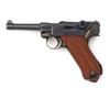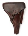 circa 1914, with 4in. blued barrel, blued receiver without date, 'DWM' monogram to toggle, blued frame with stockboard lug, chequered walnut grips and straw finished ancillaries, all matching numbers, together with two un-numbered wood based magazines, the whole retaining virtually all of an early factory refinish, together with a brown leather holster for same fitted with a cleaning rod holder and containing a 4in. cleaning rod and a magazine loading tool.