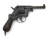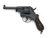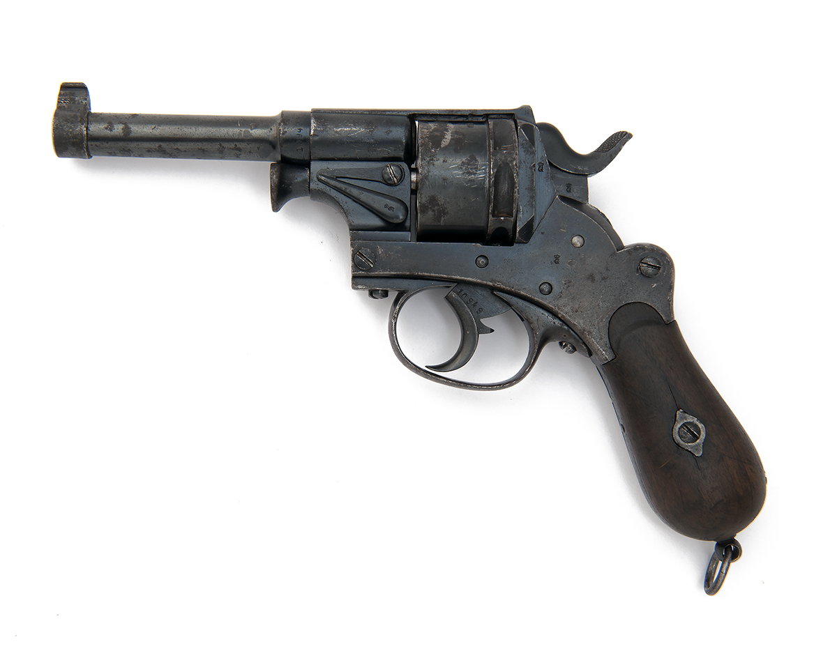 Dutch, dated for 1897, with slim profile round blued 4 7/8in. barrel, off-set muzzle with integral fore-sight, narrow sighting groove to the top-strap, blued stepped cylinder, solid frame with detachable side-plate, large pull-piece to cylinder arbor, hinged loading gate with large external spring, smooth bag-shaped walnut grips and guarded double action trigger, strong traces of blued finish remaining