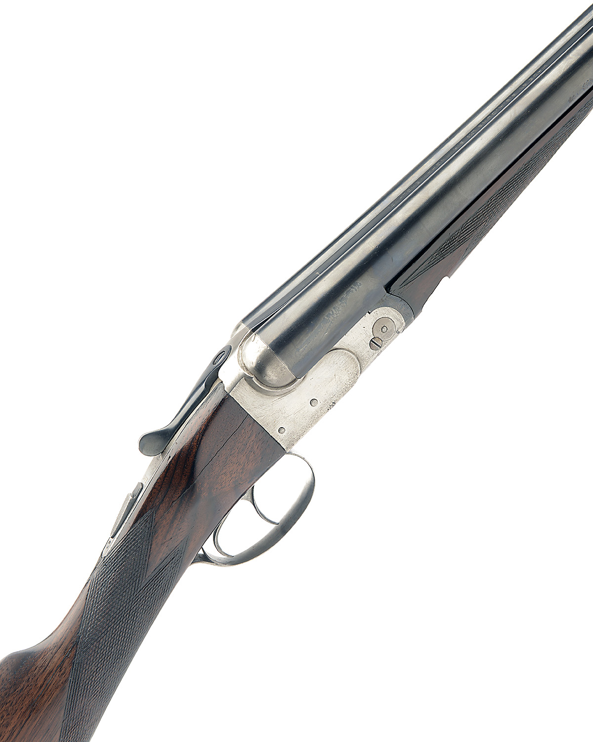 30in. nitro barrels, 2 1/2in. chambers, bored approx. true cyl. and 1/4 choke, automatic safety, plain action, 14 1/4in. stock (cracked at head, one insert repair, one loss);