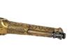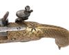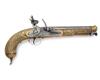 circa 1815, with octagonal iron 8in. barrel, traces of false damascening at breech-end, applied brass cannon muzzle, solid top-tang, borderline and scroll engraved flat lock of possible European manufacture, ring-necked cock, semi rainproof pan, brass full-stock engraved with borders and running vines, checker-board chequering to the bag-shaped butt, lanyard ring at pommel, guarded trigger and captive iron ramrod