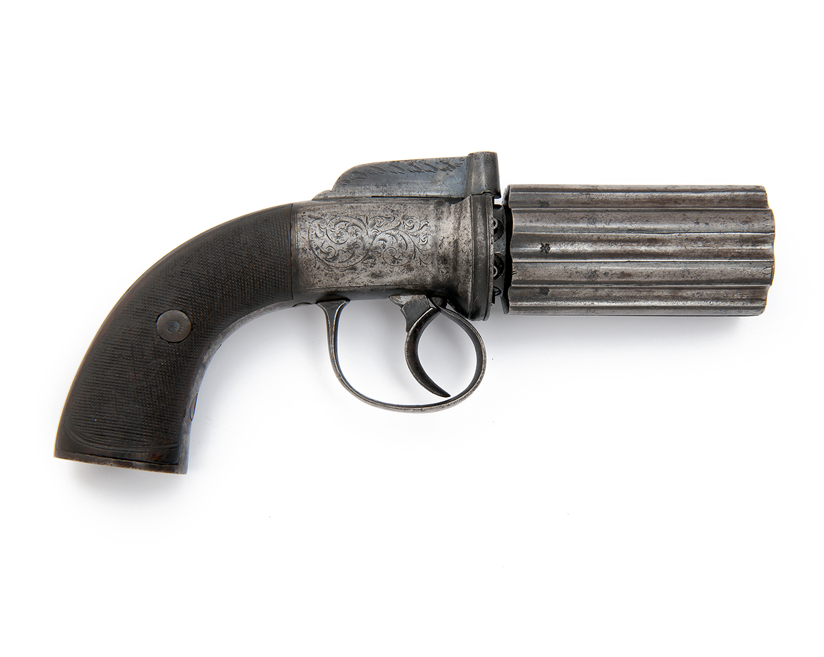 A SCARCE 100-BORE PERCUSSION EIGHT-SHOT PEPPER-BOX REVOLVER SIGNED MANTON, LONDON, no visible serial number,