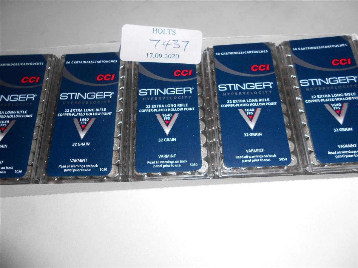500 CCI .22rf EXTRA LONG STINGER HP 1640fps Please note: Cartridges, primers and primed cases cannot be posted, if you purchase a Lot, please contact our shipping department to arrange a collection at any of our valuation days around the UK or collect from our despatch department in Wolferton PE31 6HA