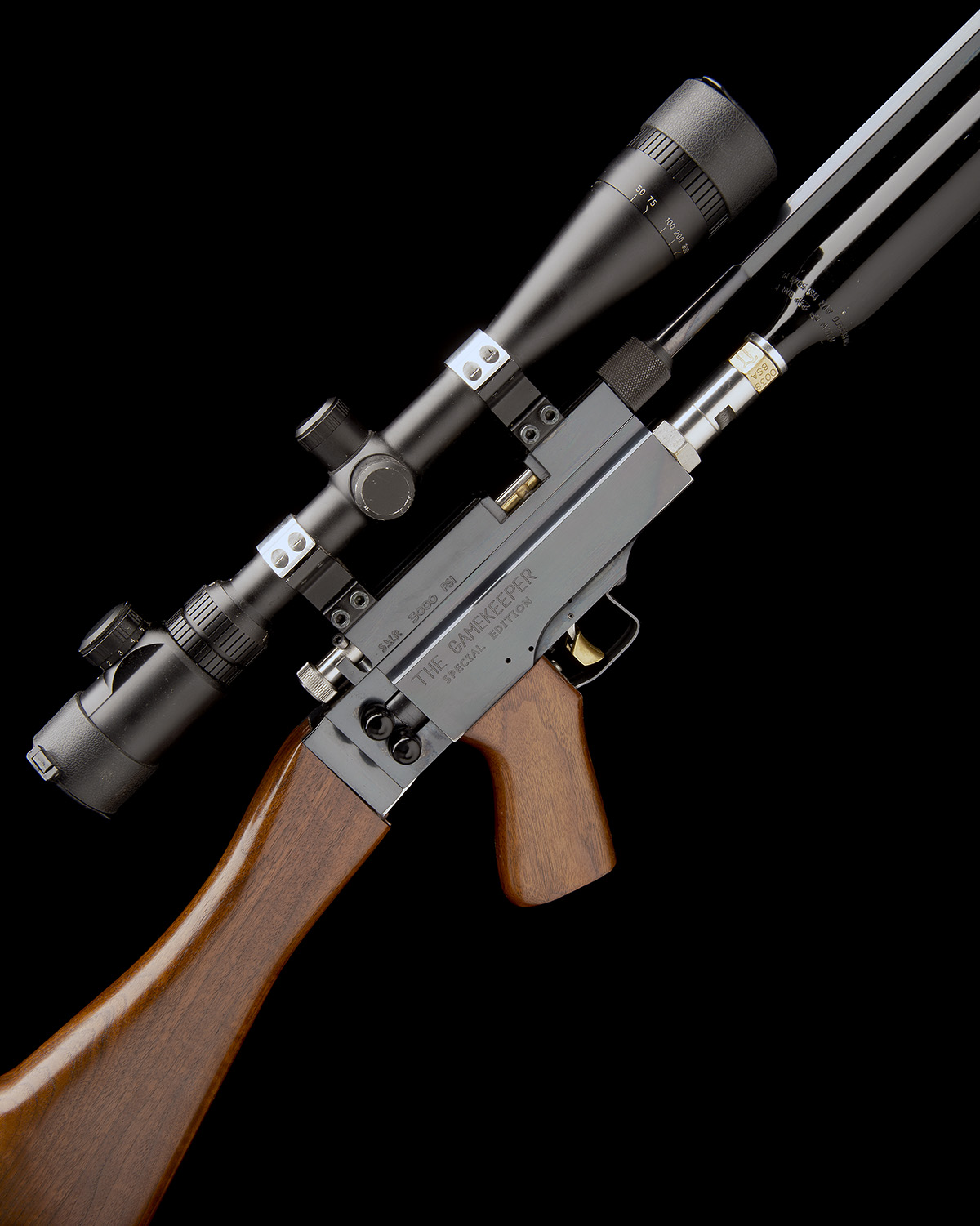 circa 1993 and one of 25 produced, with round to octagonal to round 24in. barrel including detachable Parker-Hale sound moderator, blued slab-sided receiver with twist-open bolt action loading, the right hand side deeply stamped 'THE GAMEKEEPER - SPECIAL EDITION', polished walnut butt-stock with adjustable heel-plate and separate walnut pistol-grip, detachable front mounted air cylinder, the underside of receiver marked '17 OF 25' and fitted with a Richter Optik 4-16x40 AOE telescopic sight and a brass trigger-shoe