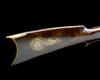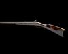 circa 1870, with heavy octagonal 33in. barrel, white metal lines at muzzle and breech, applied crescent fore-sight, standing notch rear-sight, long border engraved top-tang with provision for peep-sight (absent), border engraved back-action lock with further small florally engraved detail, dolphin headed hammer, wood half-stock with false stripy maple finish, shallow raised cheek-piece and comb of 'Roman nose form, brass furniture including patchbox with complex hinge, crescent heel-plate and trigger-guard bow with raised lower tang, double set triggers, white-metal fore-end cap and replacement wood ramrod, finish worn, some losses to top-edges of fore-end, one barrel key escutcheon absent
