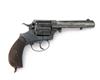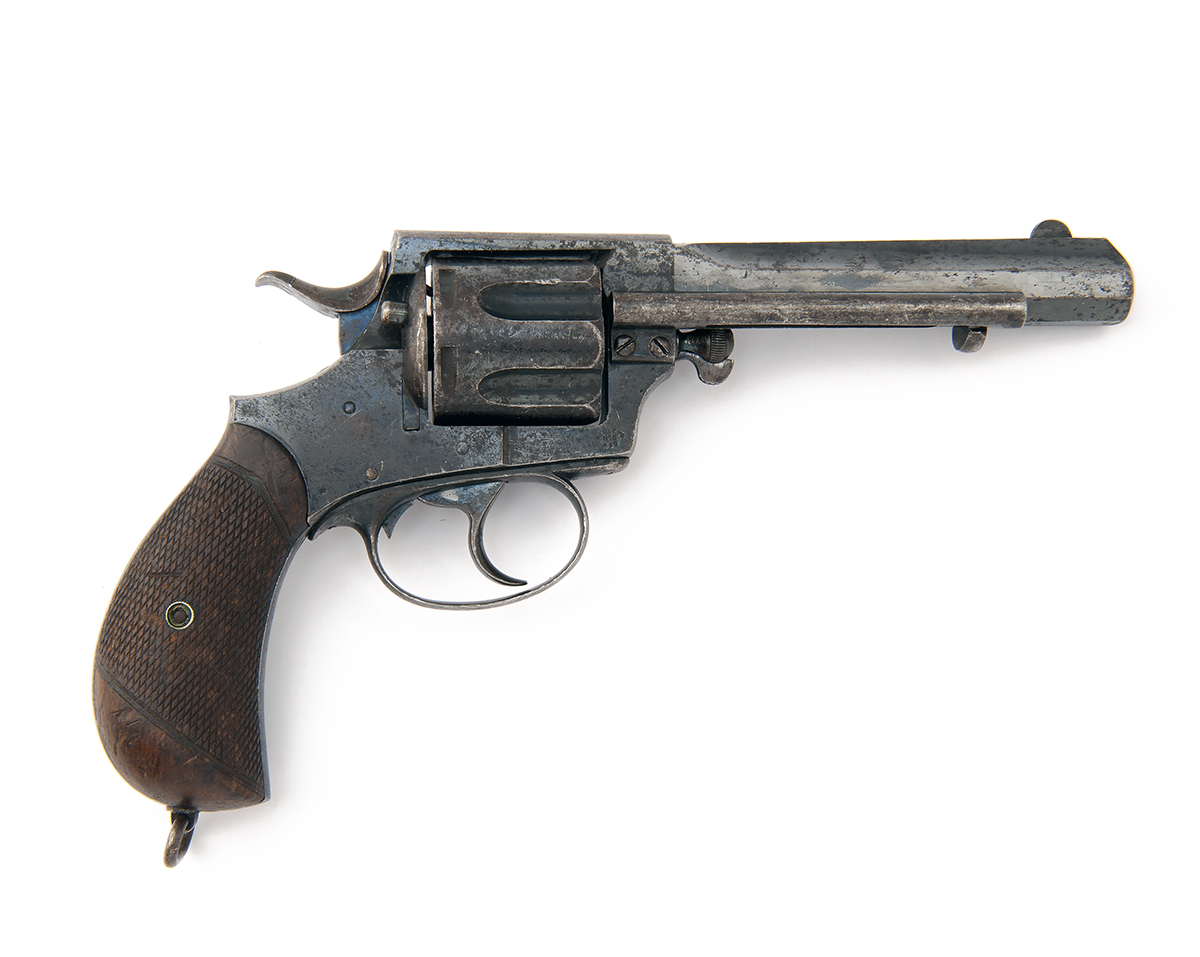 circa 1882, with blued octagonal 5 1/2in. barrel, raised sighting rib with applied crescent fore-sight, side mounted ejector-rod, sighting groove to the solid top-strap, fluted cylinder, solid frame, blued ancillaries, double action mechanism and chequered walnut birdshead grips with lanyard ring at heel, strong amount of original finish remaining