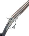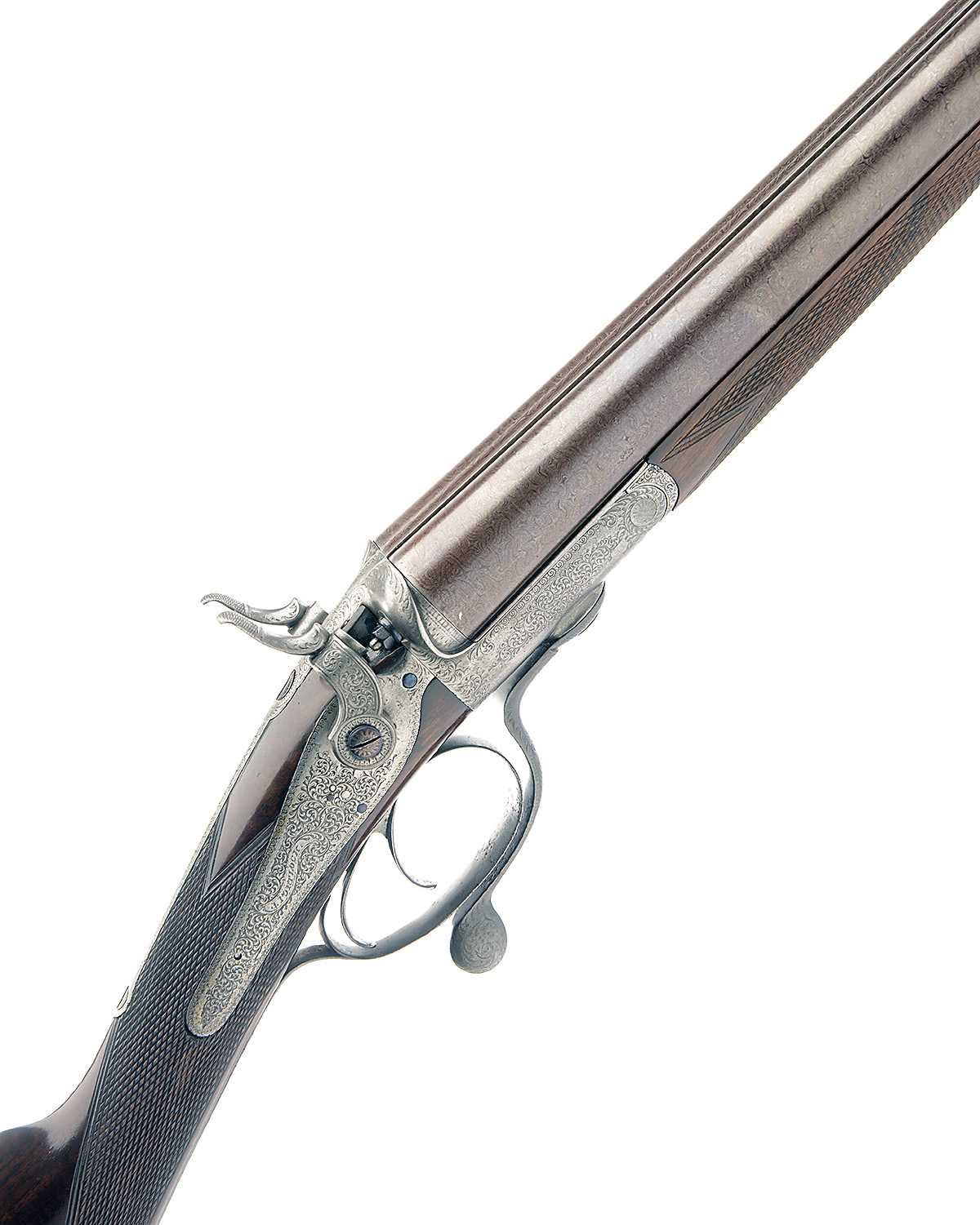 J. PORTLOCK 12-BORE ROTARY-UNDERLEVER HAMMERGUN, no visible serial number, 28 1/2in. nitro reproved damascus barrels, rib engraving illegible, 2 3/4in. chambers, bored approx. imp. cyl. choke in both, Jones patent rotary underlever, carved serpentine fences, rebounding back-action locks with hammers of hare's-ear form, border and bold acanthus scroll engraving, the makers name in a scroll banner, brushed bright finish, 14 1/2in. stock with steel heel and toe plates, replacement fore-end wood, weight 6lb. 9oz.