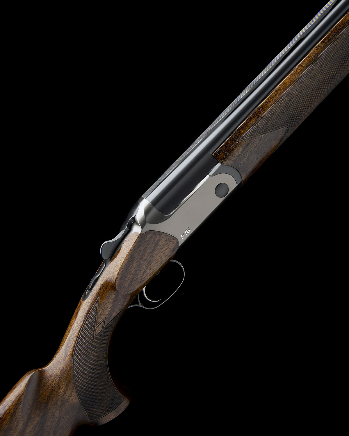 30in. 'Triplex'-steel nitro barrels (steel shot proofed, numbered FG/005008) with 9mm ventilated matt top-rib, 3in. chambers, multichokes (with original Blaser spares and two Teague extended chokes), hold-open toplever, manual safety, triggerplate mounted barrel selector switch, satin gunmetal finish with the model designation chromed in relief, 14 5/8in. figured pistolgrip stock including 3/4in. rubber recoil pad, weight 7lb. 1oz., in its universal case with original paperwork