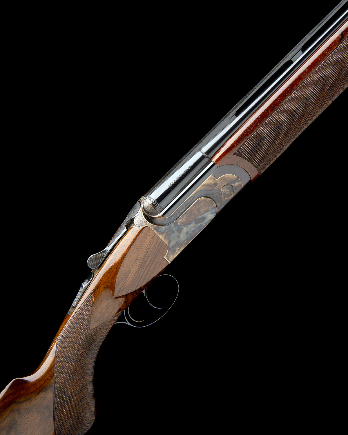 26 3/8in. nitro barrels with 6mm ventilated matt top-rib, 3in. chambers, bored approx. imp. cyl. and 1/4 choke, hold-open toplever, automatic safety, plain colour-hardened finish, 15in. semi-pistolgrip stock, weight 6lb. 6oz., in its universal case