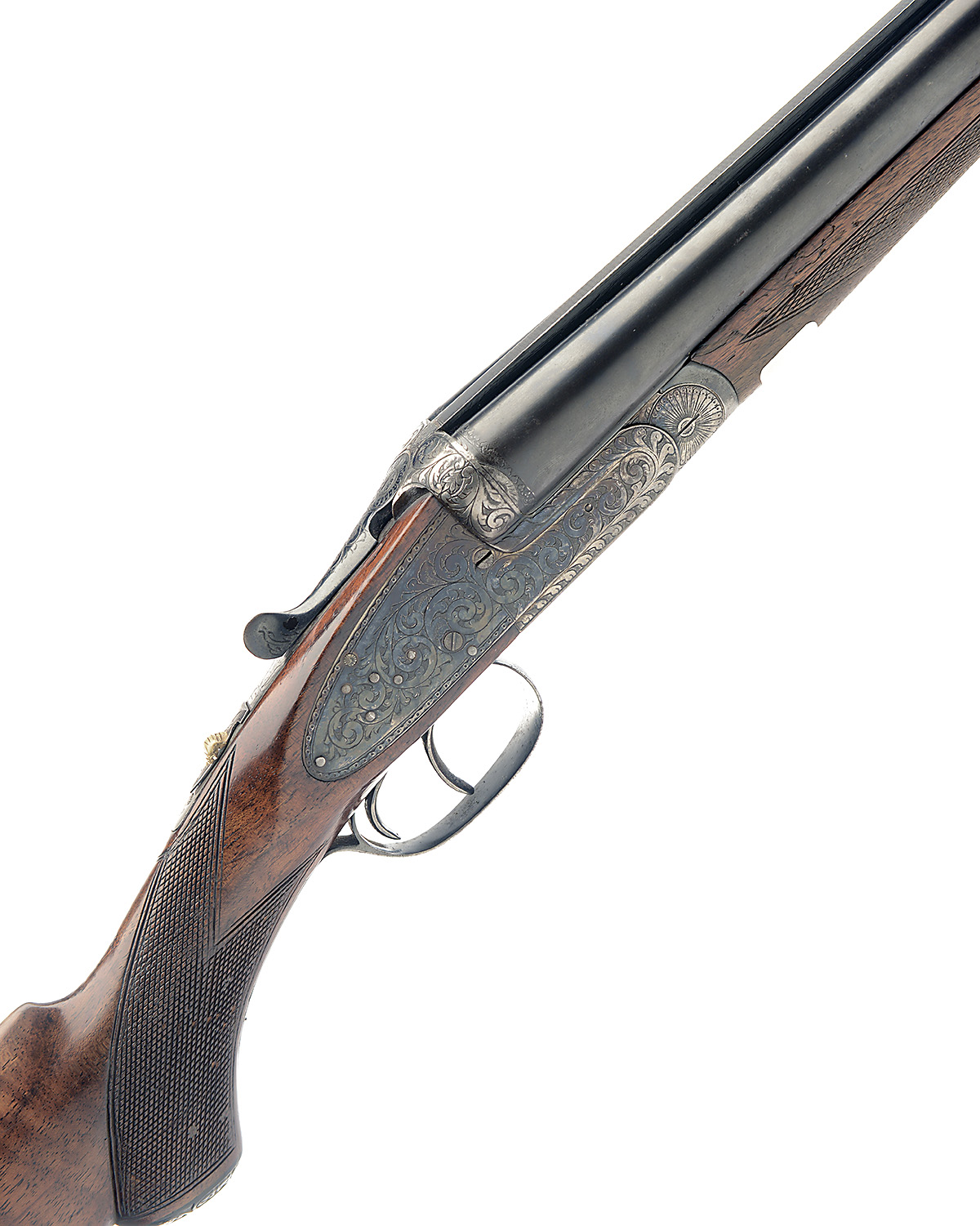 SPANISH 12-BORE SIDELOCK NON-EJECTOR, serial no. 35129, 27 1/2in. nitro barrels, 2 3/4in. chambers, bored approx. 1/2 and 3/4 choke, bolstered treble-grip action with hidden third bite, sideclips, gas checks, automatic safety, border and acanthus scroll engraving, retaining some original colour-hardening and finish, 14 1/2in. pistolgrip stock including 3/4in. ventilated rubber recoil pad (distressed)