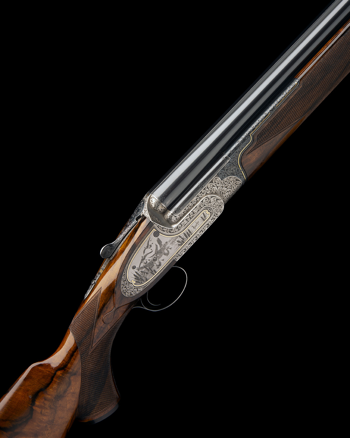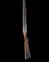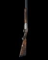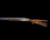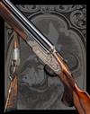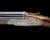hold-open toplever, manual safety, rolled-edge triggerguard, the action, lockplates and furniture carved in relief with bold acanthus scrollwork on a finely matted background, the lockplates with gold-highlighted game scene vignettes, the left side with English pointer flushing ruffed grouse in a woodland setting, the right side with mallard alighting a wetland setting, the underside with a Cape buffalo and a cattle egret, with a further ornate cartouche engraved and gold-inlaid with the makers name, the triggerplate signed 'DELAHAUT. G.', the triggerguard gold-inlaid with the serial number, the triggerguard tang engraved 'H&N', 15 1/4in. highly-figured pistolgrip stock with pistolgrip-cap and 1in. buttplate, weight 8lb. 6oz. (set 1), 8lb. 5oz. (set 2) and 8lb. 2oz. (set 3), in their lightweight leather case fitted for all three barrel sets and with some accessories