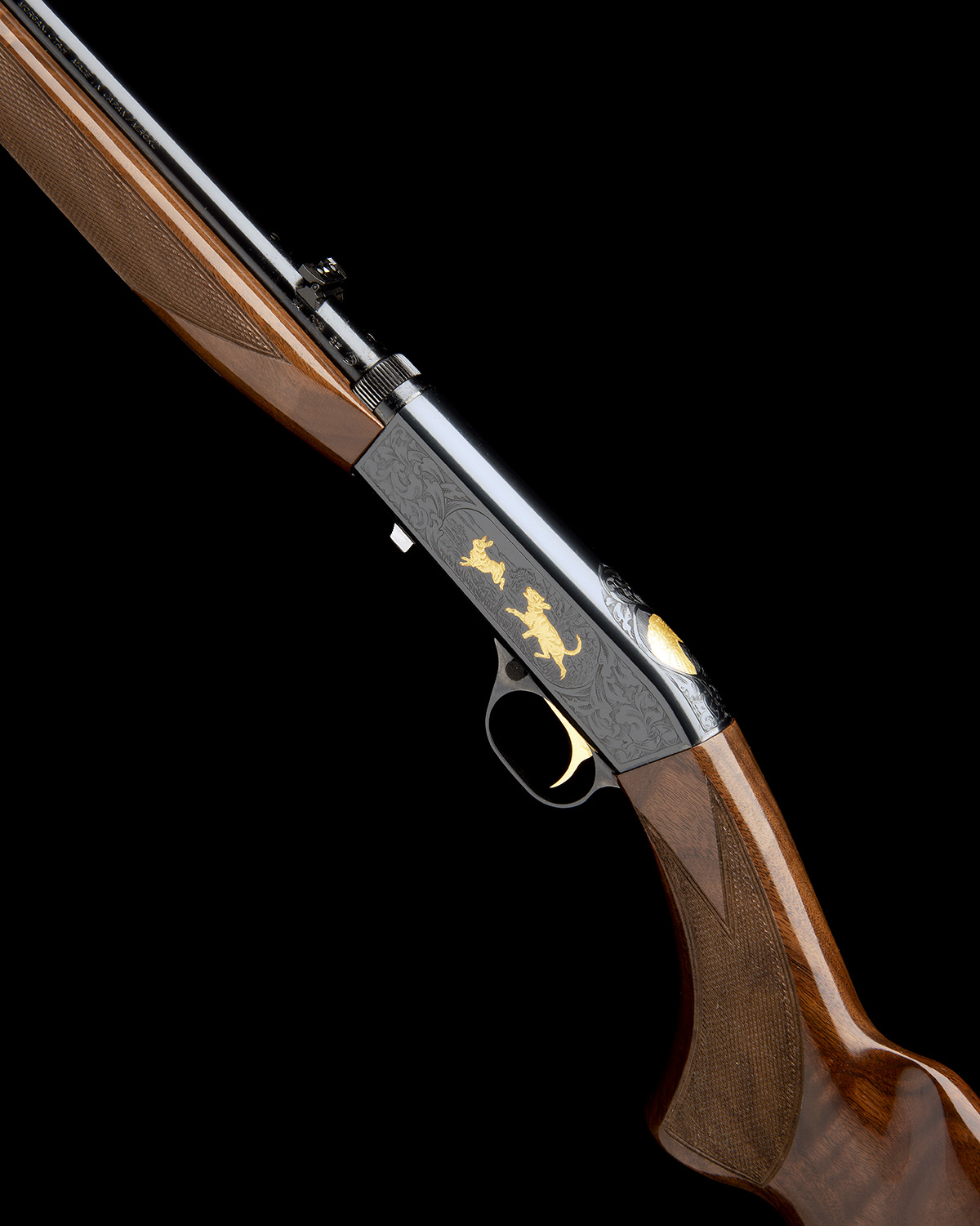 19in. nitro barrel, bead fore-sight, folding leaf rear-sight, action carved in high relief with bold scroll and ribbonwork, surrounding central gold-inlaid game scenes, manual safety, gold washed trigger, well-figured pistolgrip stock with tubular stock magazine, 14in. pull, in its makers carton