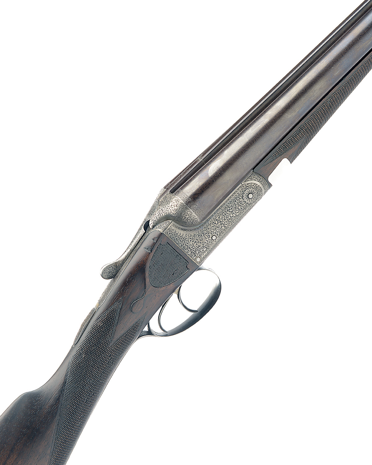 W. McCALL & CO. 12-BORE BOXLOCK EJECTOR, serial no. 31615, 26in. nitro reproved damascus barrels, the rib engraved 'W. McCALL & CO. 21/23 CASTLE ST. DUMFRIES', 2 1/2in. chambers, bored approx. true cyl. in both, unsigned treble-grip action, automatic safety with gold-inlaid 'SAFE' detail, border and acanthus scroll engraving, 15in. figured stock with chequered recessed side panels, including 2in. wooden extension, weight 6lb. 4oz.