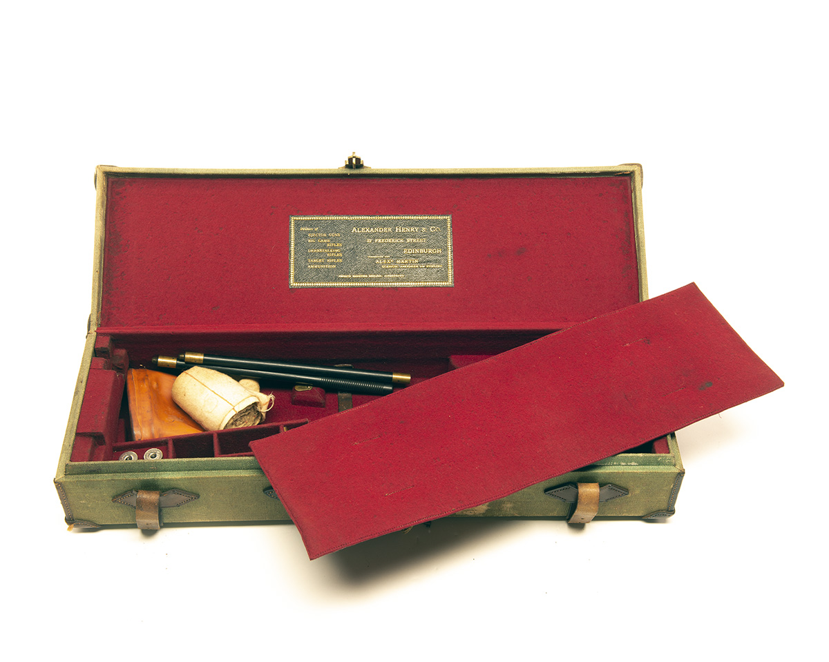 fitted for 26in. barrels, the interior lined with red baize, a leather gold-tooled Alexander Henry trade label, brass lock (including key) with a pair of 12-bore snap-caps and a three-piece ebony cleaning rod