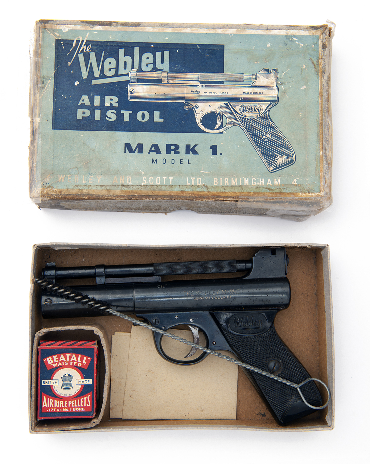 circa 1952, with rifled 6 5/8in. blued barrel, unmarked breech with sliding barrel latch, adjustable rear-sight, blued stepped air-chamber with 'THE WEBLEY MARK I' and 'MADE IN ENGLAND' on the left hand side and 'WEBLEY & SCOTT LTD BIRMINGHAM 4' and 'WEBLEY PATENTS' on the right, trigger adjuster to front of guard and chequered black hard rubber grips, each bearing a 'Webley' trademark to the top, virtually all original blued finish remaining (some storage spotting), in its makers card carton (distressed, taped repairs) and retaining its cleaning brush, and a period box of 'Beatall' pellets