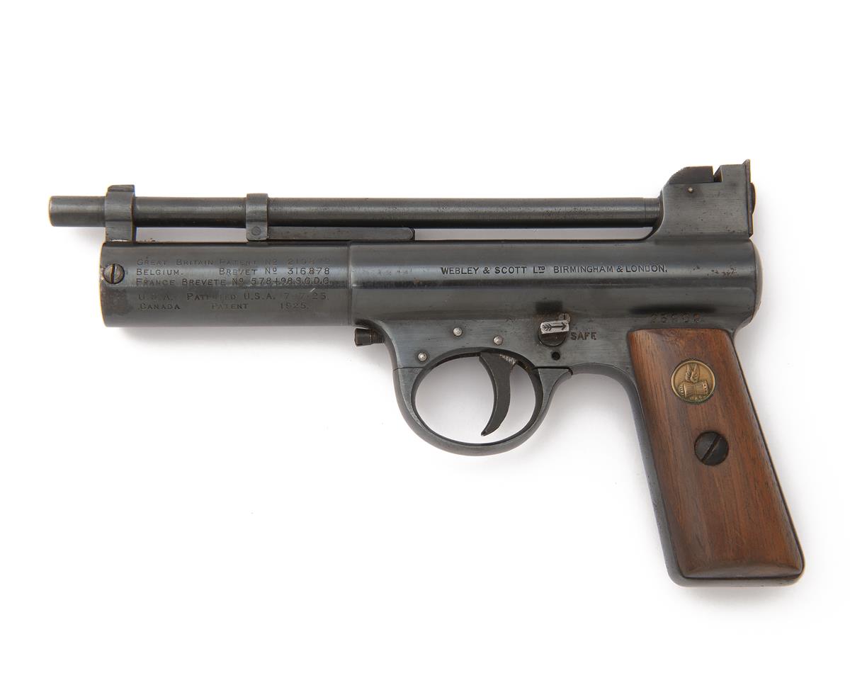 circa 1934, with rifled 7in. blued barrel, unmarked breech with sliding barrel latch, adjustable rear-sight, blued stepped air-chamber with five lines of stamped patents and 'WEBLEY & SCOTT LTD, BIRMINGHAM & LONDON' on the left and six lines of stamped patents along with the model and 'MADE IN ENGLAND' on the right, rotating safe, trigger adjuster (one pin absent from trigger guard bow) and smooth walnut grips, the left bearing a winged bullet medalion, virtually all original blued finish remaining, in a suede pouch