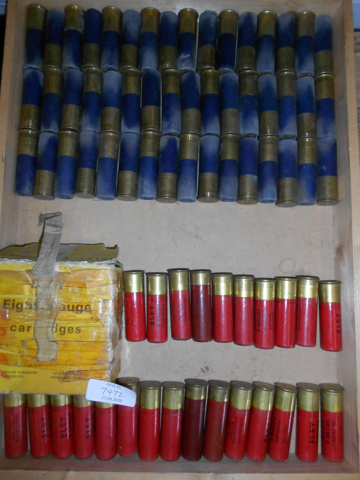 73 8 BORE CARTRIDGES FOR COLLECTORS, MOSTLY CORRODED AND SPLIT BASES BY ELEY AND DOMINION comprising of 9 Eley in complete form, 15 Eley with split bases, 1 distressed Eley carton, 48 Dominion loaded with 4, 6, and BB shot, bases resized for use in shotguns