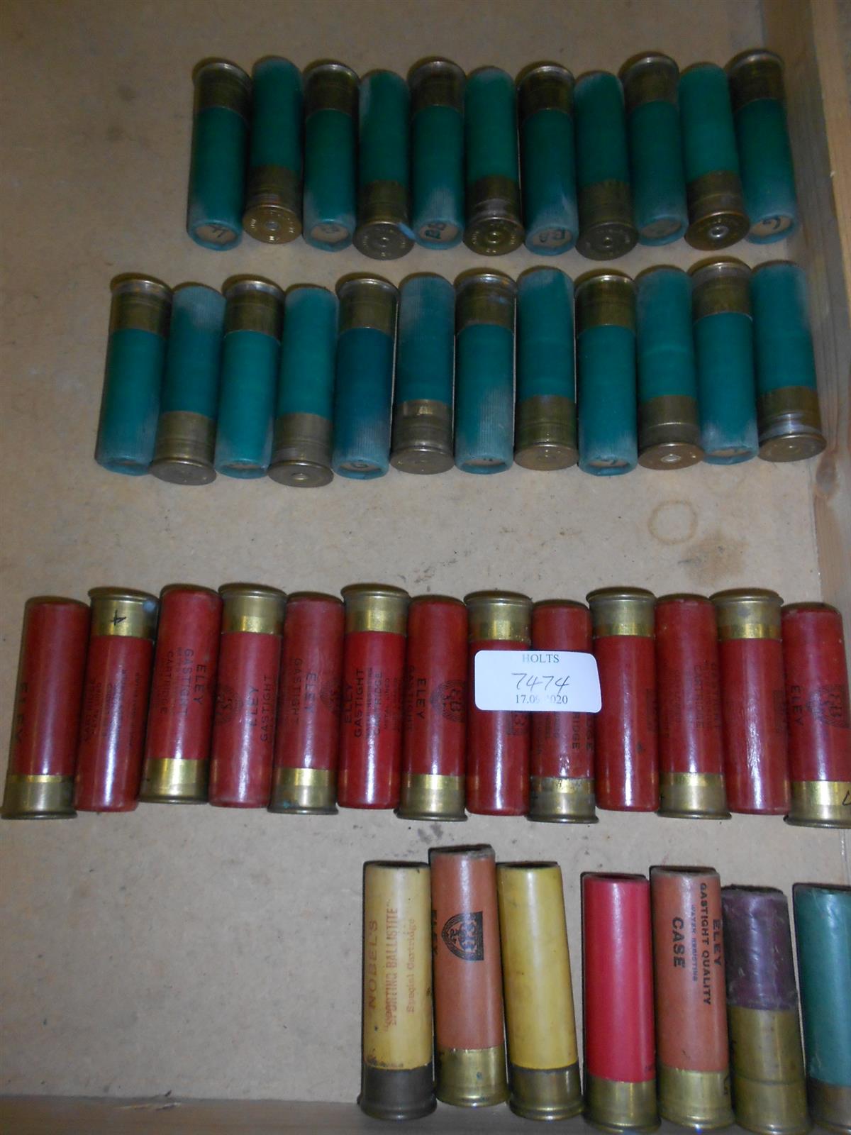 43 8 BORE CARTRIDGES FOR COLLECTORS, ELEY, NOBEL AND REMINGTON comprising of: 13 Eley Gastight 3 in. RT No. 1 shot, 23 Remington Industrial 3 in, BB and 4 shot. 2 3 in. Nobel's Sporting Ballistite by Eley, 1 Green Eley London 3 in. 1 Maroon hi brass Eley London Gastight slightly deformed rt., 1 Eley 3 in corroded base, 2 Eley Nobel orange case slight corrosion No 1 shot.