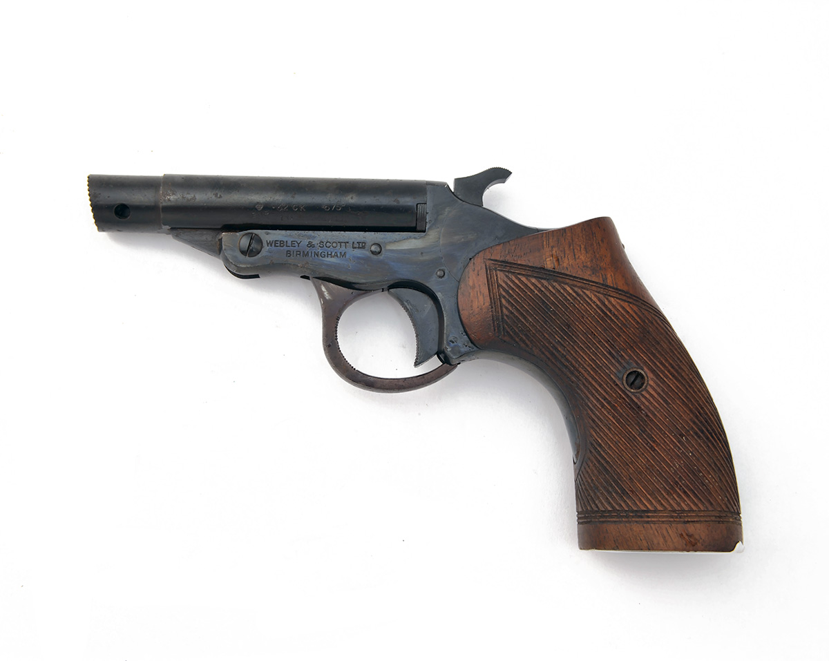 A .32 (CK) SINGLE-SHOT HUMANE KILLER SIGNED WEBLEY & SCOTT, serial no. N589, with blued 4in. barrel, contact muzzle-break, break-open frame, oversize walnut grip and much original finish throughout
