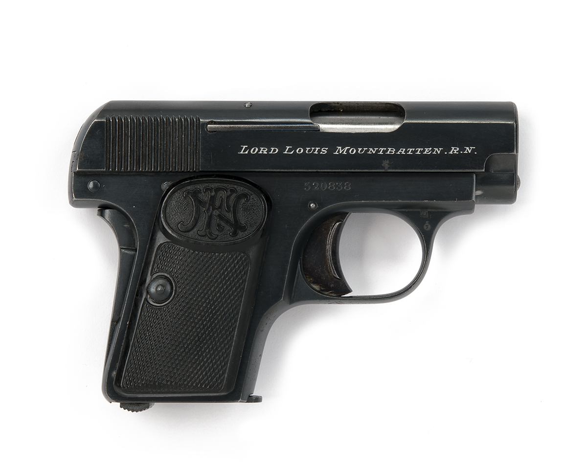 Provenance: In 2013 the British Ambassador to Ireland, Dominick Chilcott wrote to the 2nd Countess Mountbatten of Burma (Patricia) and daughter of Louis, 1st Earl Mountbatten of Burma and alerted her to the discovery of her father's Browning pistol.