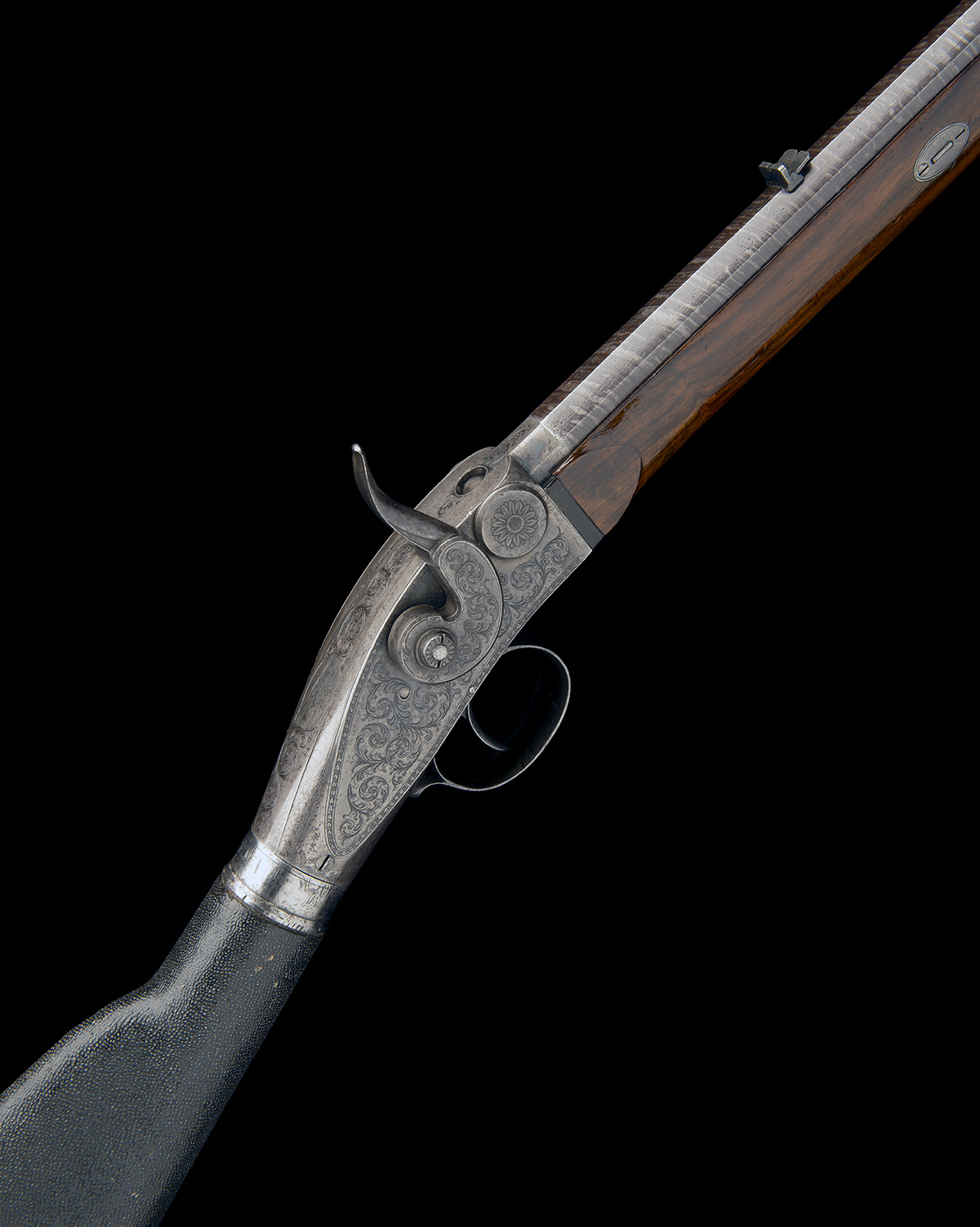 circa 1845, with interchangeable 30in. twist iron shot and rifle barrels, the multi-groove rifle barrel of octagonal form and signed 'G & S DEANE, 30 KING WILLIAM ST LONDON BRIDGE', dove-tailed fore-sight, twin folding leaf rear-sight and provision for underbarrel ramrod, the round 30in. shot barrel with identical signature but within an engraved needle terminating in a sunburst, bead fore-sight and provision for ramrod, swept border and scroll engraved colour hardened slab-sided action body, large rotary loading tap with 'C' shaped handle, long-eared engraved dummy hammer for cocking, guarded trigger and sliding safety catch, detachable butt reservoir covered in black shagreen and fitted with a smooth iron heel-plate, walnut fore-end with horn spacer and tip (both with small losses) and the original brass mounted mahogany ramrod, the whole in fine condition with much original finish and colour and complete with its original oak storage case, compartmented and lined in green baize and containing the original stirrup-pump, turn-screw, accessories such as the end-cap for storing the stock detached and a later bullet-mould, the case generally very good but missing the key and lock escutcheon