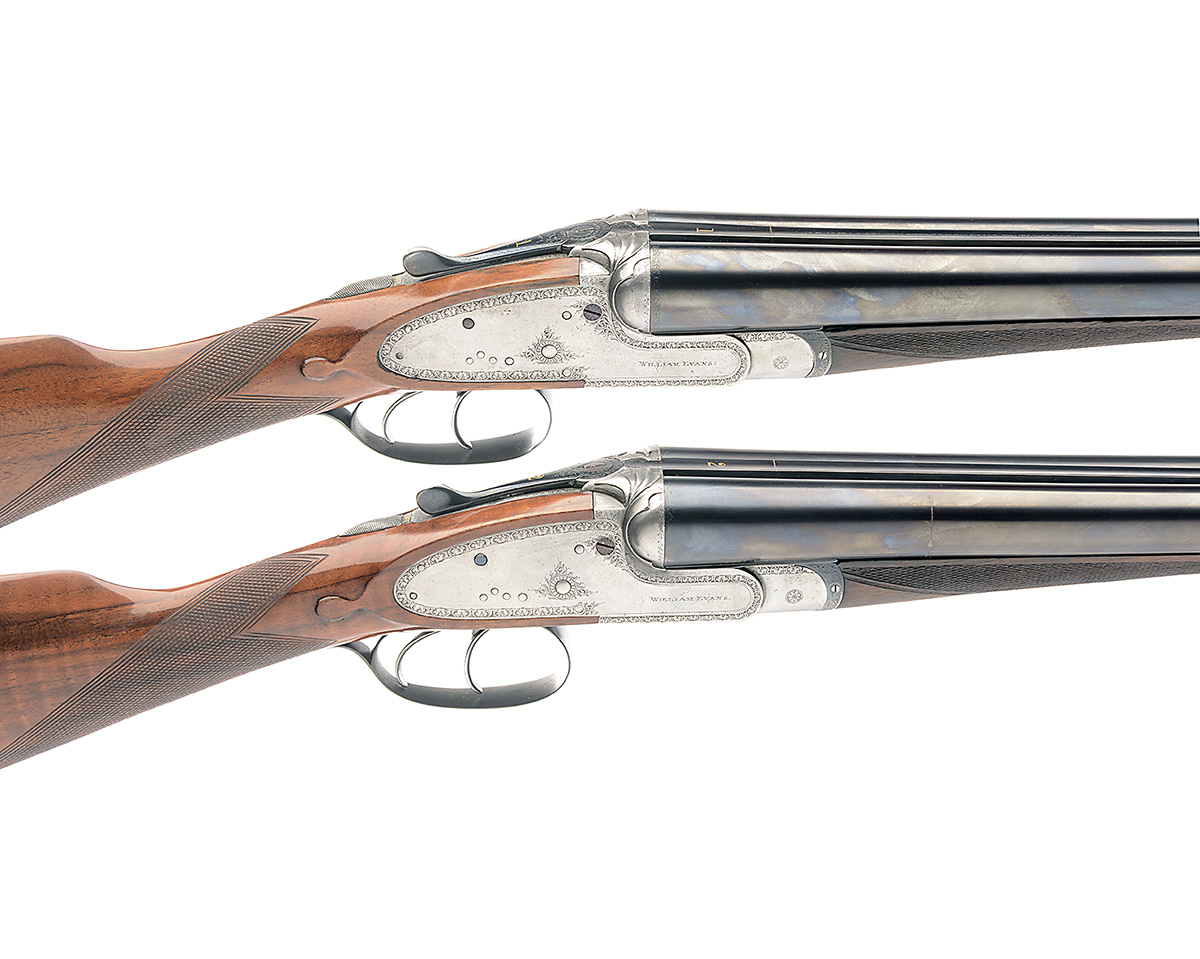 A PAIR OF WILLIAM EVANS 12-BORE SIDELOCK EJECTORS, serial no. 4018 / 9, 28in. replacement nitro barrels (No.1, circa 1984), rib engraved ' WILLIAM EVANS. 63. PALL MALL. ST. JAMES'S. LONDON.' and gold-inlaid '1' at the breech end, 2 3/4in. chambers, bored approx. 1/4 and 1/2 choke, 28in. sleeved barrels (No.2), rib gold-inlaid '2' at the breech end, 2 1/2in. chambers, bored approx. 1/4 and 1/2 choke, treble-grip actions with carved stylised leaf fences, removable striker discs, toplevers gold-inlaid '1' and '2', automatic safeties with gold-inlaid 'SAFE' details, foliate border engraving, brushed bright and reblued finish overall, 14 1/2in. figured replacement stocks, weight 6lb. 10oz., in their brass-cornered leather case