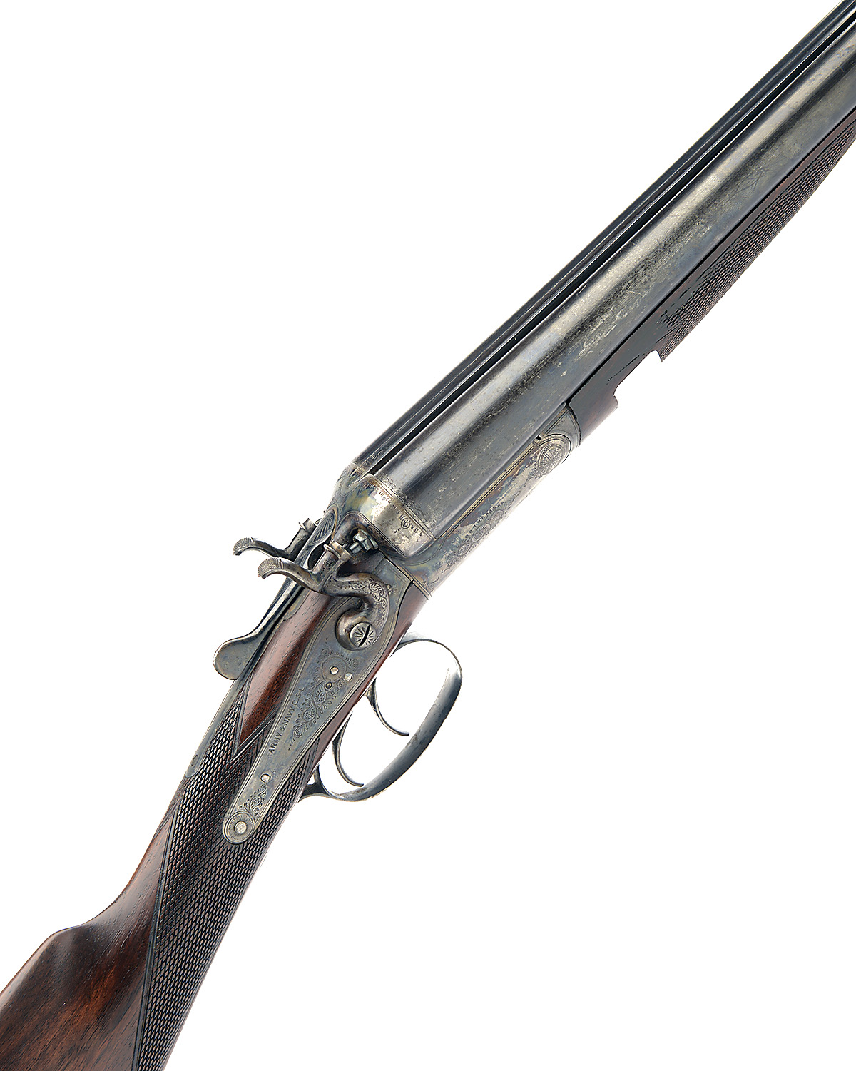 ARMY & NAVY 12-BORE TOPLEVER HAMMERGUN, serial no. 70818, 30in. nitro barrels, the rib engraved 'ARMY & NAVY C.S.L. LONDON.', 2 1/2in. chambers, bored approx. true cyl. and 3/4 choke, rebounding back-action locks, border and partial acanthus scroll engraving, retaining much colour-hardening and finish, 14 1/4in. stock, snap-on fore-end with horn finial, weight 6lb. 14oz.