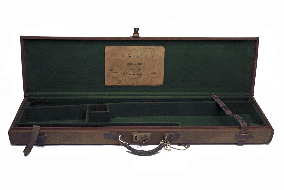 A GALLYON & SON CANVAS SINGLE GUNCASE, fitted for 28in. barrels, the interior lined with green baize, a Gallyon & sons trade label, brass lock (key missing)